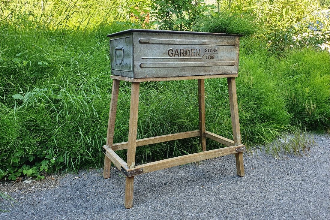Cette jardinière s'inspire des bacs industriels que l'on trouve dans les ateliers. Pourvu de poignées latérales en métal vous pourrez déplacer le bac en toute simplicité. Elle repose sur un piètement en bois qui apporte un style rural chic à l'ensemble.