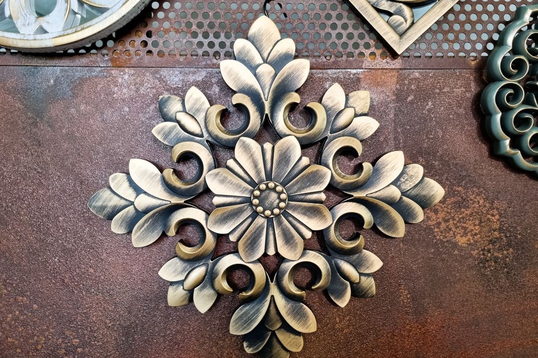 Décoration murale vintage noir et dorée patinée en plastique à accrocher.