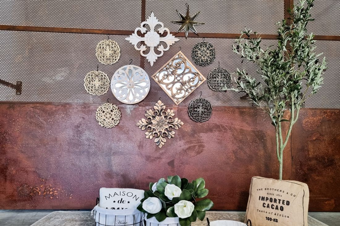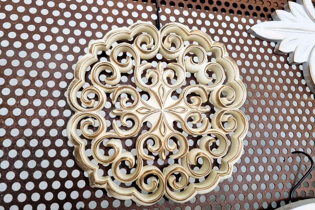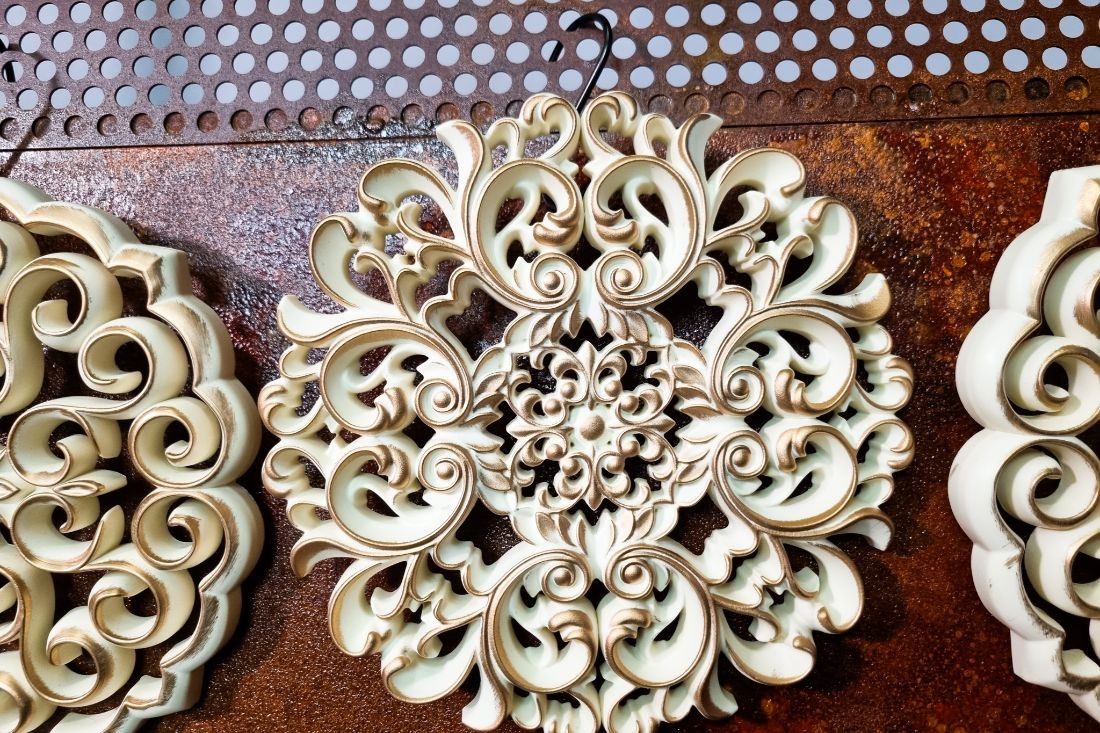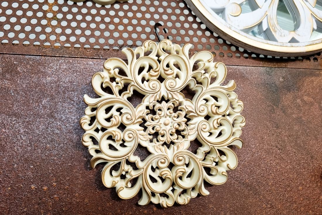 Lot de 3 rosaces en plastiques beiges dorées patinées à accrocher au mur.