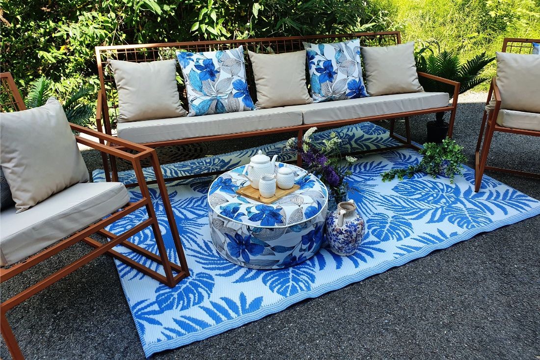 Tapis de jardin Exotique bleu - Motifs feuilles bleues - Idéal pour l'extérieur.