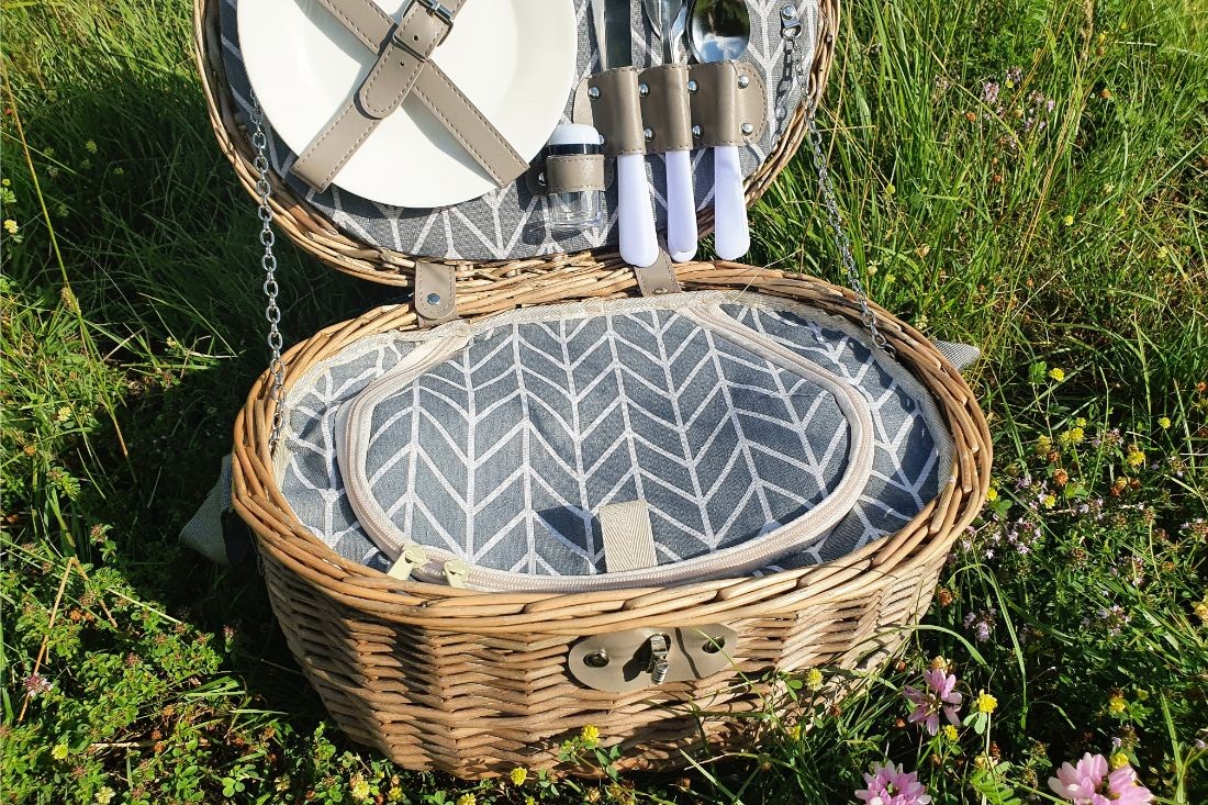 Panier de pique nique pour 2 personnes - 2 assiettes, 2 fourchettes, 2 couteaux, 2 cuillères, 2 verres à pieds, tire-bouchon, poivrier & salière - Lanières pour porter le panier - Isotherme - Décoration de jardin - Idée cadeau original pour l'été.