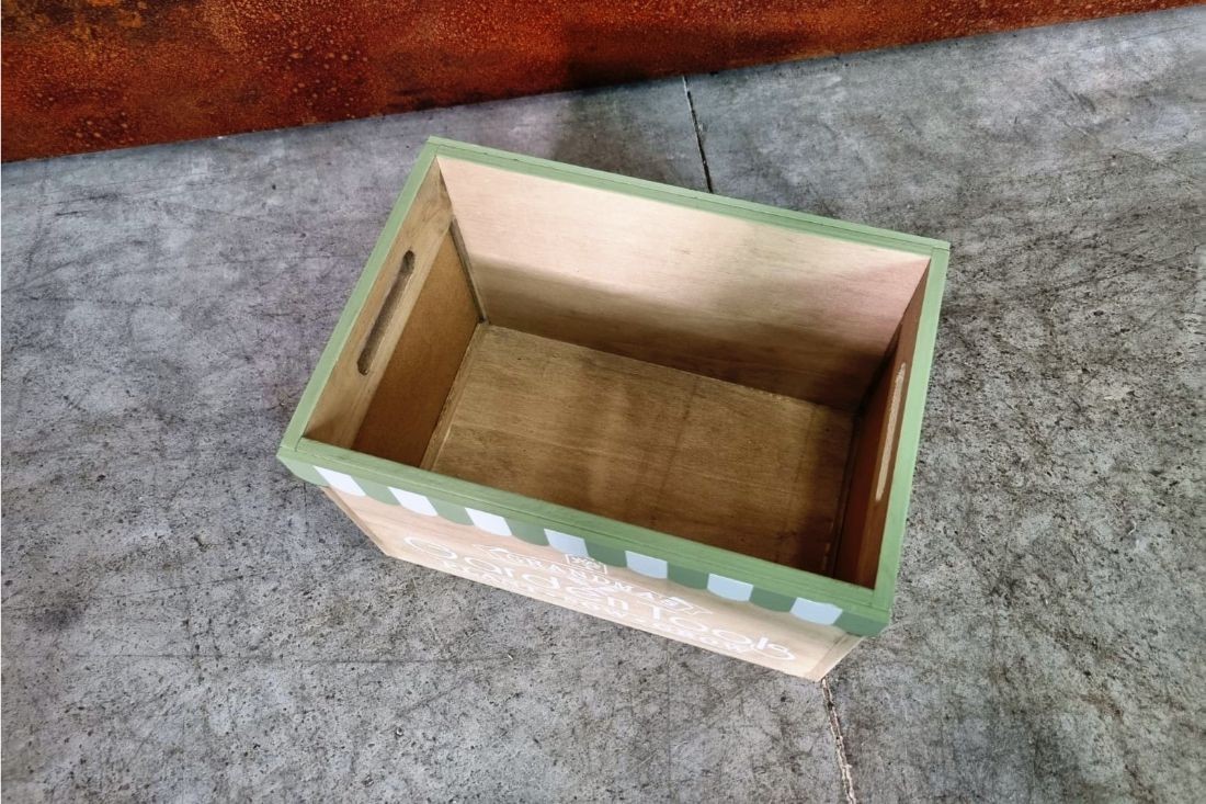 Caisses Garden Tools en bois, avec ardoise noir, couleur: fanion vert et blanc.
