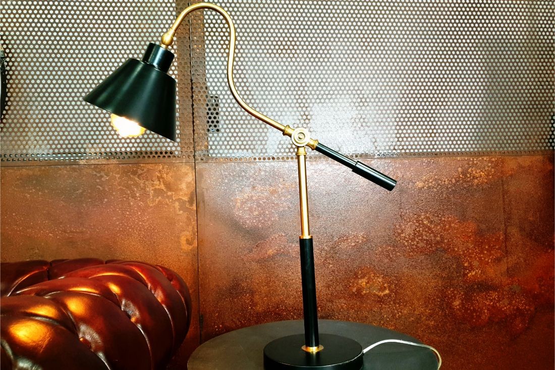 Lampe Vintage, métal finition noir mat et doré, réglable - En stock.