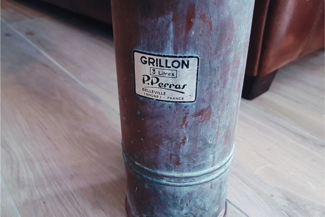 Dans son jus, le devant est marqué avec le nom de la marque. Ce pulvérisateur « Grillon » capacité de 3 litres, fabriqué par les Etablissements Perras à Belleville Rhône. Corps en cuivre, raccords laiton, poignée bois, joints cuir, soudures étain.