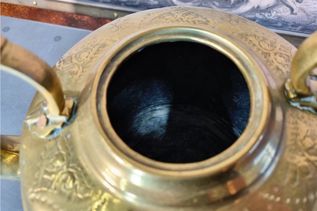 Le Laiton est un alliage composé de cuivre et zinc. La principale raison qui a fait que les artisans utilise cet alliage c'est qu'il est facile à travailler et à décorer. Après que les artisans auront fini de travailler la théière celle-ci sera plaqué avec de l'argent pour la rendre brillante et résistante à la corrosion.