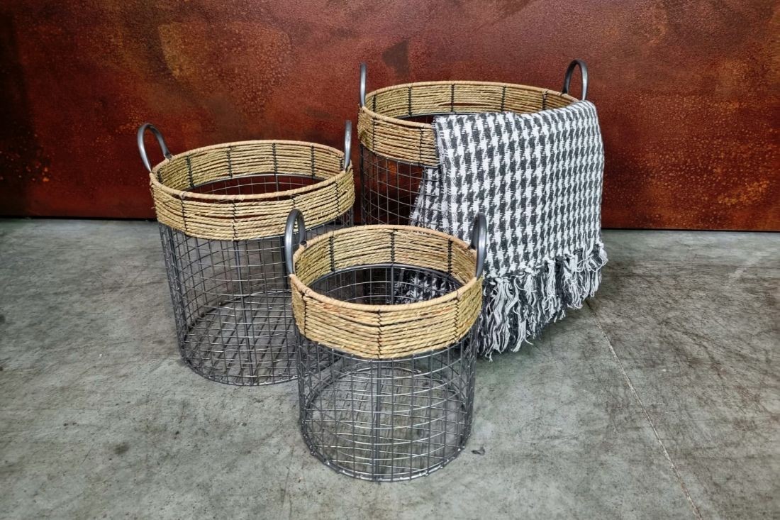 Paniers en grillages et osier avec poignée métal - Couleur gris - Lot de 3 - Différentes tailles