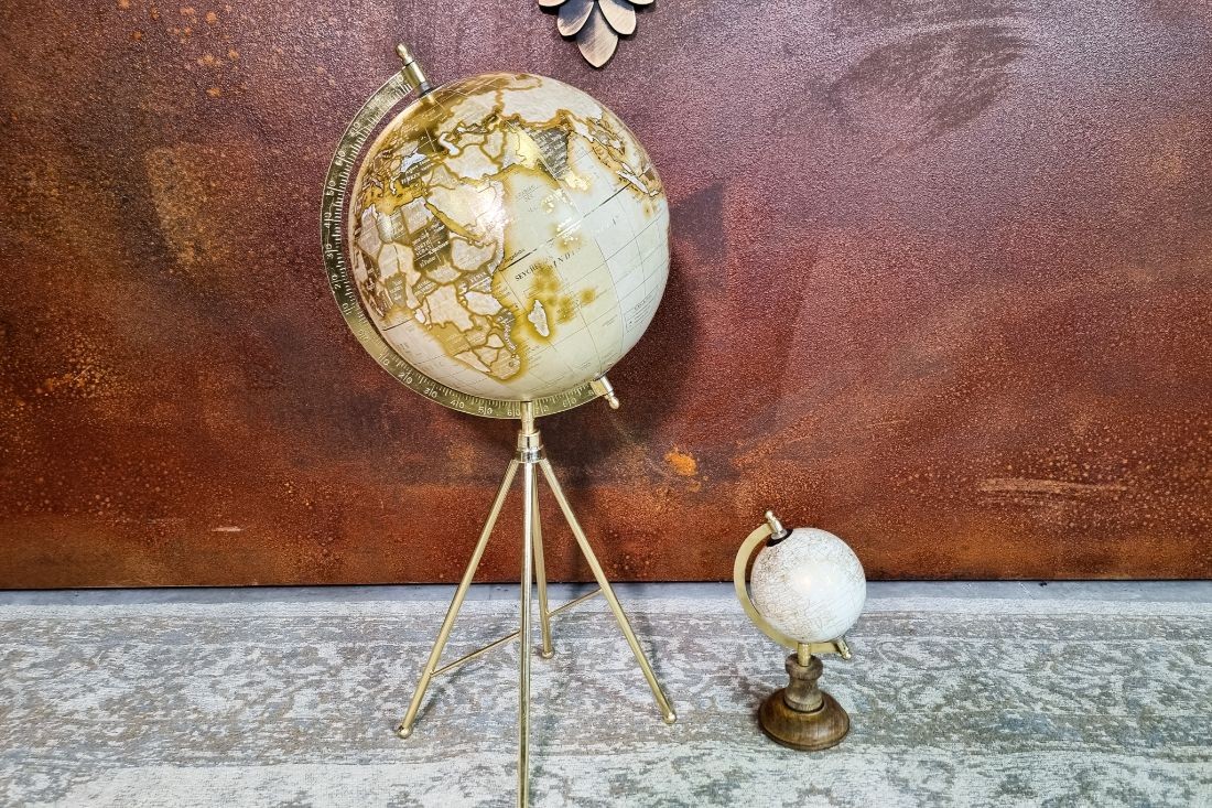 Ce globe doré est un très bel accessoire de décoration pour votre intérieur. Avec son trépied en métal or, et ses couleurs douces, il se fond discrètement dans une décoration industrielle. Il peut tout a fait intégrer un style de décoration Steampunk également. En plus d'être un très bel objet de décoration, le globe est utile. Il permet de prendre connaissance du monde dans son entièreté. Les enfants les adorent, lorsqu'ils apprennent la géographie. C'est un accessoire indispensable pour les aider à situer les informations visuellement dans l'espace. Et pourquoi pas identifier sur votre globe les endroits que vous avez visité.